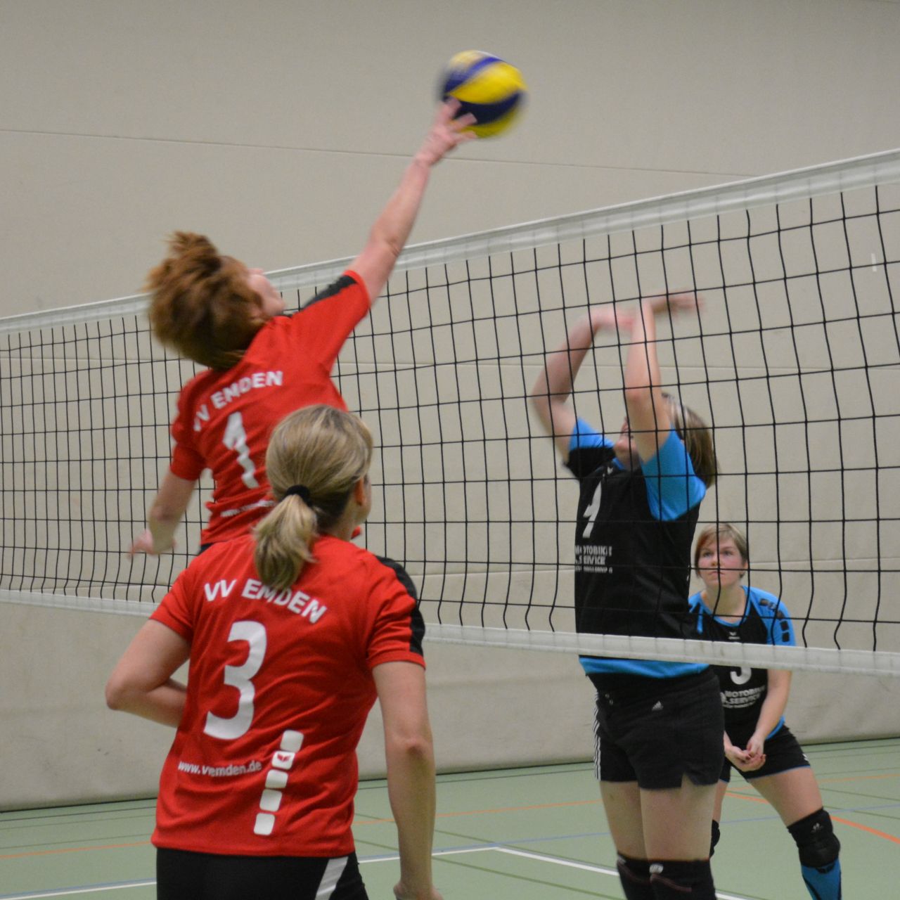 Der Auftakt verlief jedoch alles andere als geplant. Etwas überraschend, aber völlig zu Recht, ging der BSC Burhafe im ersten Satz mit 10:1 in Führung. Desaströse Annahmefehler, kaum Möglichkeiten für einen Spielaufbau für die Zuspielerin – und dann noch viele Eigenfehler im Angriffsspiel – beim VVE lief alles schief. Immerhin konnten die die VVE Damen anschließend mithalten – aber auch nicht mehr. Angaben – eigentlich eine Stärke der Emder Spielerinnen, wurden weiter reihenweise verschlagen, so ging der erste Satz der Saison mit 18:25 verloren. Das mochten die VVE-Damen nun doch nicht so hinnehmen, zumal vor eigenem zahlreichen Publikum. Ab dem zweiten Satz fanden die VVE-Damen zurück zu