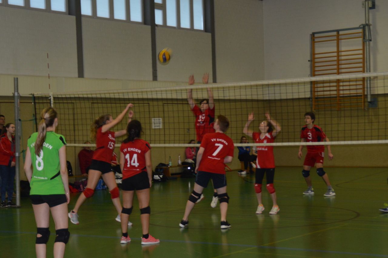 Das erste Spiel bestritt VVE III, die sich anfangs schwer taten gegen die Nortmoorer. Nach kurzer Führung des VVE setzte sich Nortmoor immer besser in Szene, konnte immer wieder punkten und vorbeiziehen, um dann doch ganz knapp mit 23:25 zu verlieren. Großes Aufatmen beim VVE! Aber auch der zweite Satz war extrem eng, keine Mannschaft konnte sich entscheidend absetzen, bis die VVE-Mannschaft auf den letzten Metern einen Zahn zulegte und den Satz mit 25:20 gewann. Damit war der Widerstand der Nortmoorer gebrochen, die VVE- Mädchen spielten im dritten Satz konzentriert und sicher ihr Spiel, vielleicht die beste Leistung in dieser Saison, und gewannen mit 25:10.