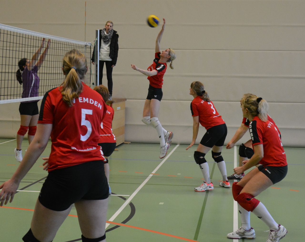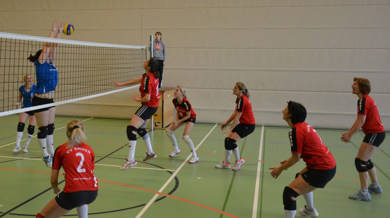 Der erste Satz gegen die Damen aus Aschendorf/Papaenburg startete sehr ausgeglichen. Nach einer 10:7 Führung schwächelte plötzlich die Emder Annahme. Aschendorf machte sechs Punkte in Folge und lag nun mit 13:10 vorne. Eine Auszeit auf Emder Seite sollte wieder Ruhe und Ordnung ins Emder Spiel bringen – mit Erfolg. Denn fortan setzten die Emder Damen die Aschendorfer mit platzierten Angaben so unter Druck, dass den Gästen kaum noch ein präziser Spielaufbau gelang. Mit 25:16 wurde der erste Satz letztlich doch klar gewonnen. Auch in den folgenden Sätzen konnten die zahlreichen Zuschauer konzentrierte und engagierte Spielzüge der Emderinnen bejubeln. Kein Ball wurde verloren gegeben … mitunter weite Wege für die Zuspielerin … und dann immer wieder druckvolle Angriffe. Aschendorf spielte eigentlich gut mit, so entstanden immer wieder lange Ballwechsel … für die Zuschauer ein schönes Spiel. Dennoch konnte der VVE auch die folgenden Sätze recht klar mit 25:12 bzw. 25:17 für sich