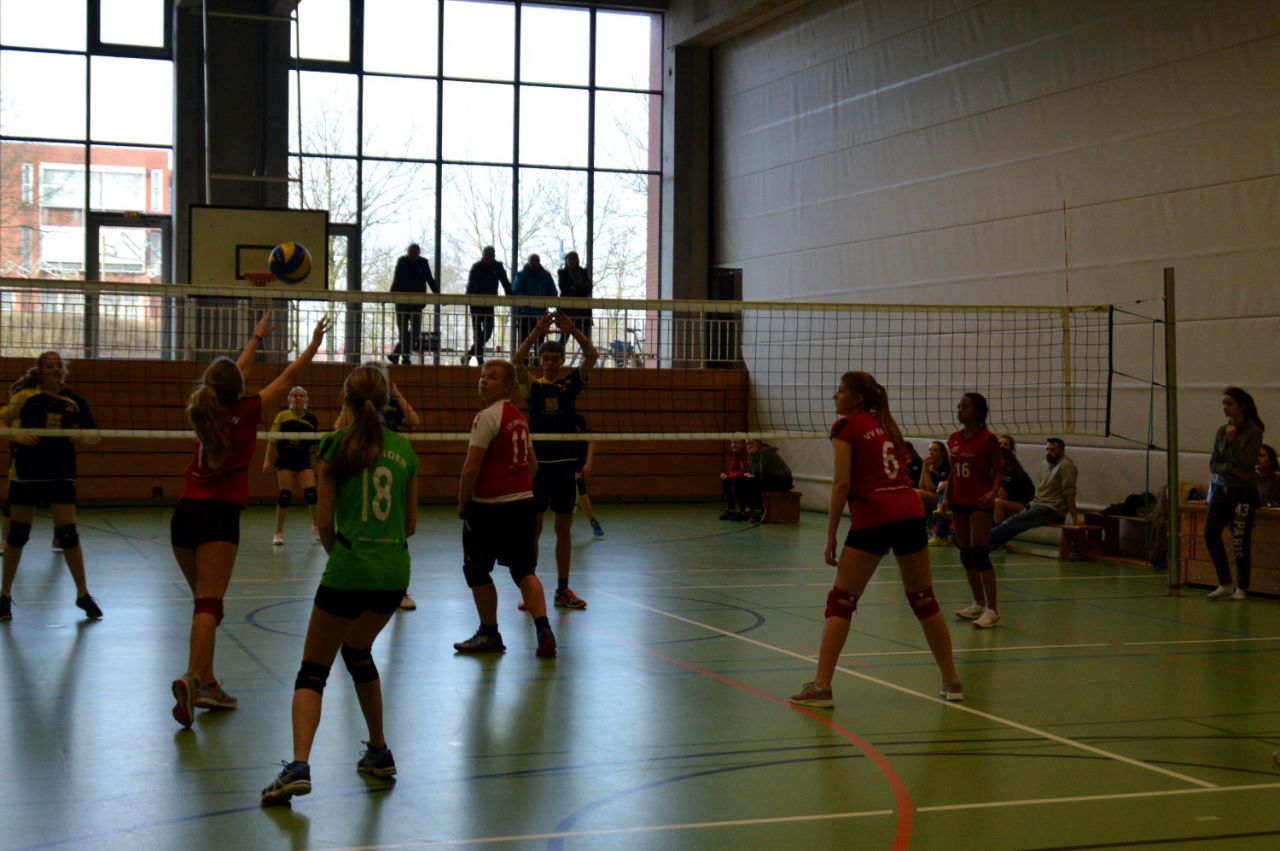 Spielerfahrung sammeln müssen. Deshalb wurde diesen Samstagvormittag auch keine unserer U 16 Spielerinnen eingesetzt, die bereits in der Kreisklasse spielen. Insofern rechneten sich die beiden Trainer Philipp Thiele und Christopher Post auch wenig Chancen insbesondere gegen die Mannschaft des TuS Hinte aus, deren Spielerinnen z. T. schon Bezirksliga und Kreisligaerfahrung haben. Insofern kam anfangs nur wenig Spiel zustande, aber Annahme- und Angabefehler des TuS brachten dem VVE immerhin 14 Punkte ein. Im zweiten Satz war Hinte dann konzentrierter und spielerisch überlegen, Der VVE konnte nur teilweise gegenhalten und verlor den Satz klar mit 7:25.