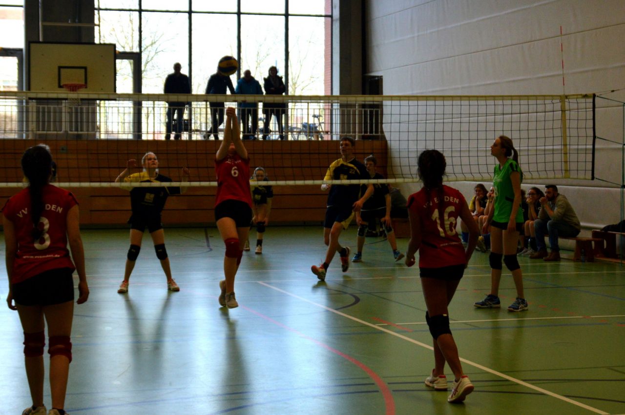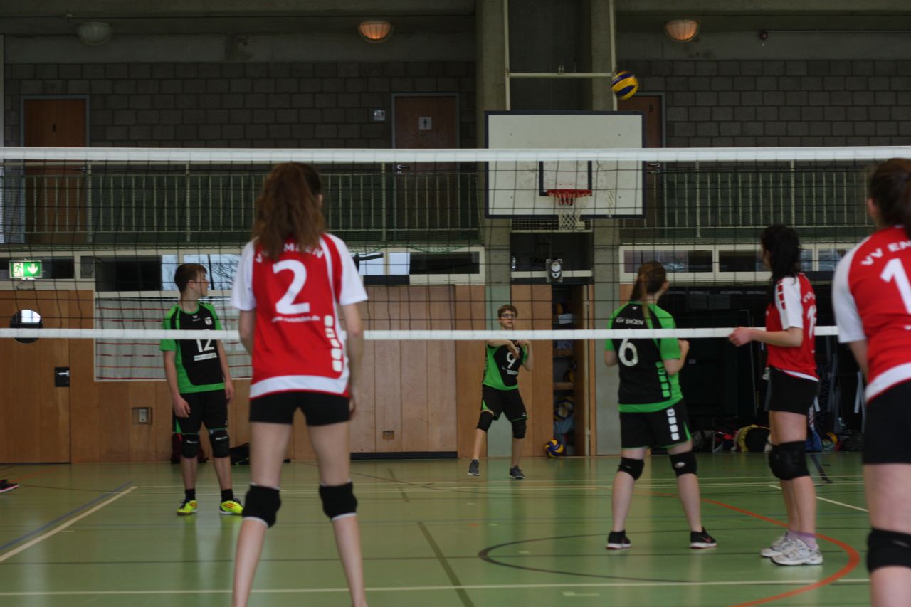Gegen den RSV Emden, der mit fünf Jungen und einem Mädchen antrat, lief es schon besser. Der VVE war wieder motiviert. Der RSV war zwar technisch überlegen, hatte aber mit vielen Absprachefehlern zu kämpfen. Trotzdem ging der Satz mit 16:25 verloren. Im zweiten Satz ging der VVE mit 7:4 in Führung und konnte diese sogar bis zum 9:6 durch konzentriertes Spiel halten. Über 11:11 kam der RSV aber wieder in die Spur und konnte seine Eigenfehler abstellen und das Spiel mit 14:25 für sich entscheiden.